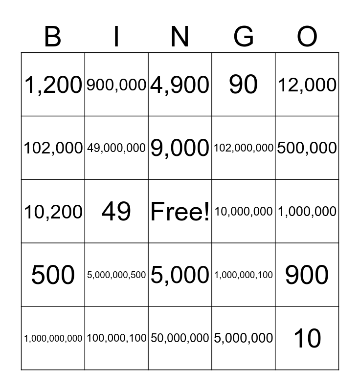 This bingo card has a free space and 29 words: 1,000,000,000, 1,020, 49, 490, 1,200, 4,900, 49,000,000, 5,000,000,500, 10,000,000, 100,000,100, 1,000,000, 10, 50,000,000, 5,000,000, 500,000, 50,000, 5,000, 500, 12,000, 10,200, 1,000,000,100, 100, 102,000,000, 102,000, 90, 900,000, 900, 9,000 and 900,000,000.