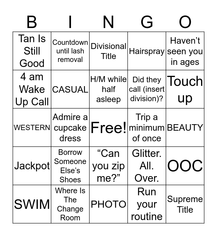 This bingo card has a free space and 24 words: Borrow Someone Else’s Shoes, Where Is The Change Room, H/M while half asleep, SWIM, Haven’t seen you in ages, Tan Is Still Good, 4 am Wake Up Call, Countdown until lash removal, Trip a minimum of once, “Can you zip me?”, Did they call (insert division)?, WESTERN, Glitter. All. Over., OOC, CASUAL, Run your routine, BEAUTY, Divisional Title, Touch up, Admire a cupcake dress, Supreme Title, Jackpot, Hairspray and PHOTO.