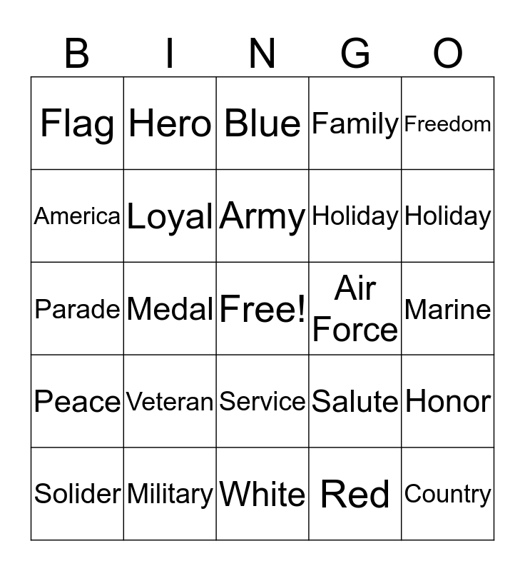 This bingo card has a free space and 24 words: Veteran, Military, Army, Solider, Freedom, Flag, America, Hero, Air Force, Service, Holiday, Parade, Salute, Honor, Loyal, Red, Marine, Blue, Holiday, Medal, Country, Peace, Family and White.