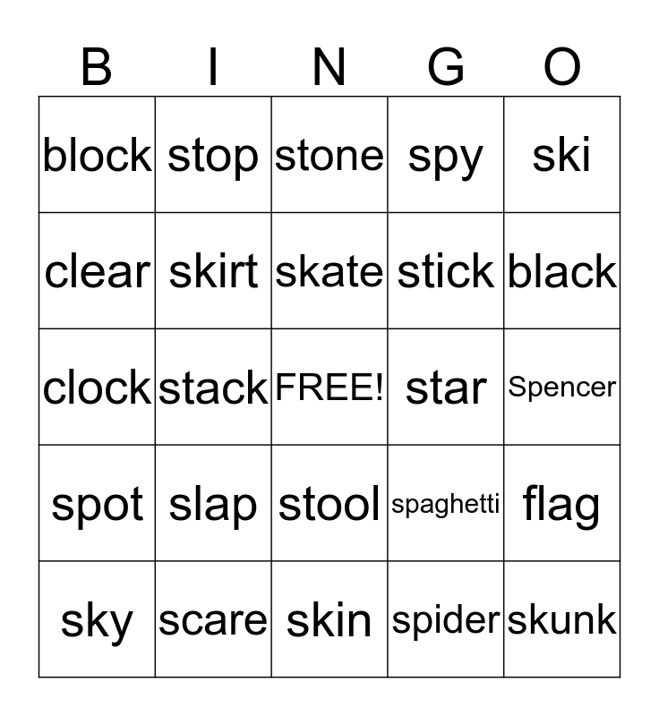 This bingo card has a free space and 24 words: slap, scare, skate, sky, ski, block, clear, stop, star, stool, stick, clock, spaghetti, flag, skirt, spider, Spencer, stone, black, stack, skunk, spot, spy and skin.