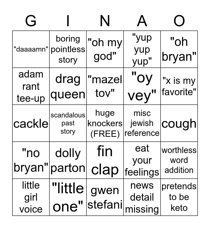 This bingo card has a free space and 24 words: dolly parton, "little one", "mazel tov", little girl voice, "oh bryan", "daaaamn", adam rant tee-up, boring pointless story, misc jewish reference, fin clap, "oy vey", cackle, eat your feelings, worthless word addition, drag queen, news detail missing, cough, "oh my god", "x is my favorite", scandalous past story, pretends to be keto, "no bryan", "yup yup yup" and gwen stefani.