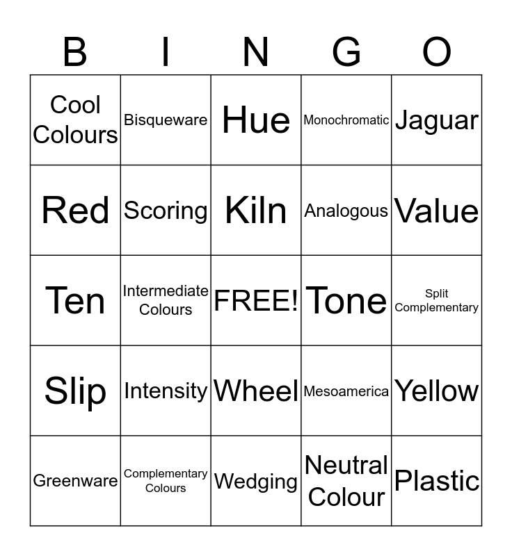 This bingo card has a free space and 33 words: Primary Colours, Secondary Colours, Intermediate Colours, Tona, Slip, Scoring, Jaguar, Greenware, Bisqueware, Leather-hard, Kiln, Hue, Shade, Tint, Tone, Value, Complementary Colours, Ten, Intensity, Mesoamerica, Wheel, Warm Colours, Cool Colours, Split Complementary, Wedging, Plastic, Monochromatic, Analogous, Red, Yellow, Green, Neutral Colour and Blue.