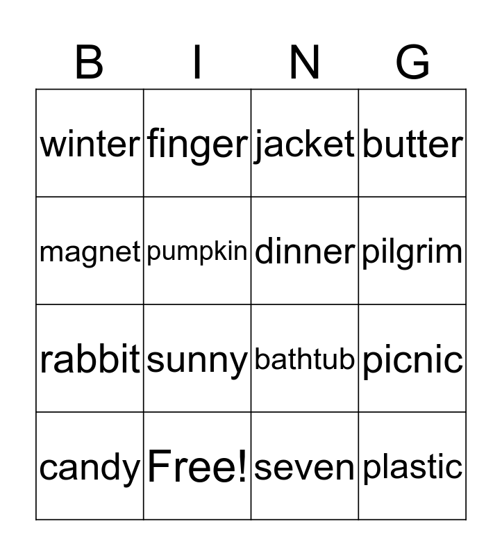 This bingo card has 25 words: wagon, number, pilgrim, cobweb, magnet, winter, pumpkin, finger, Free!, lipstick, rabbit, bathtub, zipper, ketchup, dinner, napkin, seven, jacket, sunny, picnic, candy, thankful, plastic, butter and mascot.