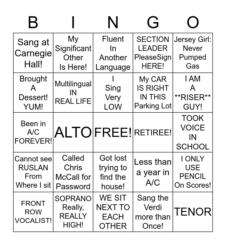 This bingo card has a free space and 24 words: Called Chris McCall for Password, SOPRANO Really, REALLY HIGH!, I Sing Very LOW, FRONT ROW VOCALIST!, Jersey Girl: Never Pumped Gas, Sang at Carnegie Hall!, Brought A Dessert! YUM!, My Significant Other Is Here!, RETIREE!, Got lost trying to find the house!, My CAR IS RIGHT IN THIS Parking Lot, Been in A/C FOREVER!, Less than a year in A/C, I ONLY USE PENCIL On Scores!, Multilingual IN REAL LIFE, Sang the Verdi more than Once!, TOOK VOICE IN SCHOOL, Fluent In Another Language, I AM A **RISER** GUY!, ALTO, TENOR, Cannot see RUSLAN From Where I sit, SECTION LEADER PleaseSign HERE! and WE SIT NEXT TO EACH OTHER.