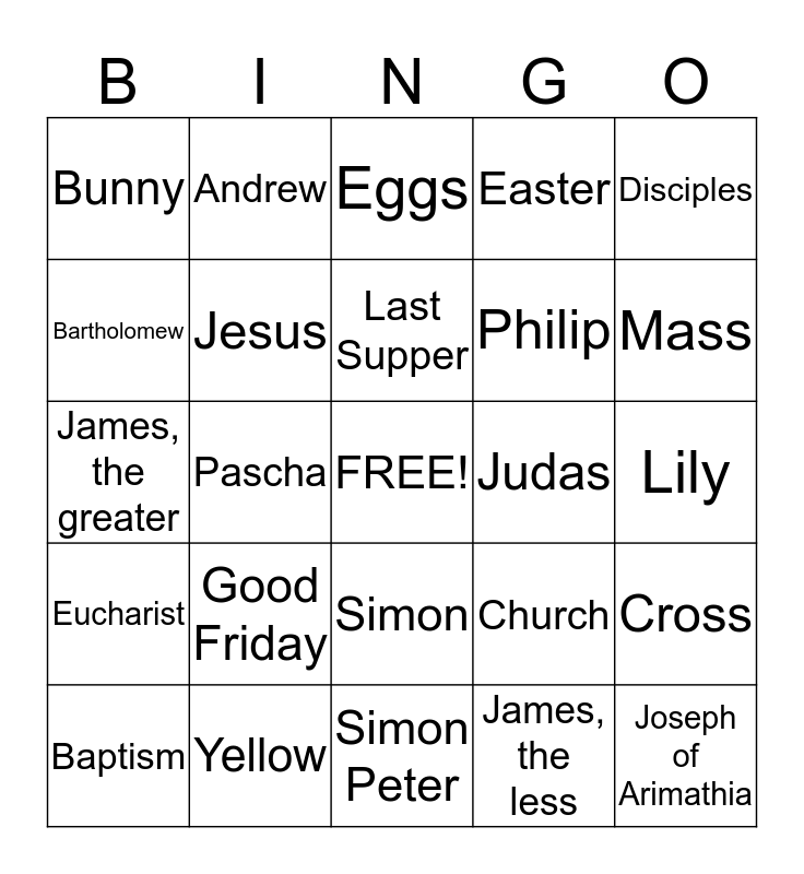 This bingo card has a free space and 36 words: Holiday, Crucifixion, Christian, Jesus, Church, Eucharist, Last Supper, Vigil, Disciples, Resurrection, Pascha, Easter, Sunday, Judas, Mass, Bunny, Egg Hunt, Good Friday, Joseph of Arimathia, Eggs, Lily, Cross, Yellow, Baptism, Simon Peter, Andrew, James, the greater, John, Philip, Bartholomew, Matthew, Thomas, James, the less, Simon, Thaddaeus and Palm Sunday.