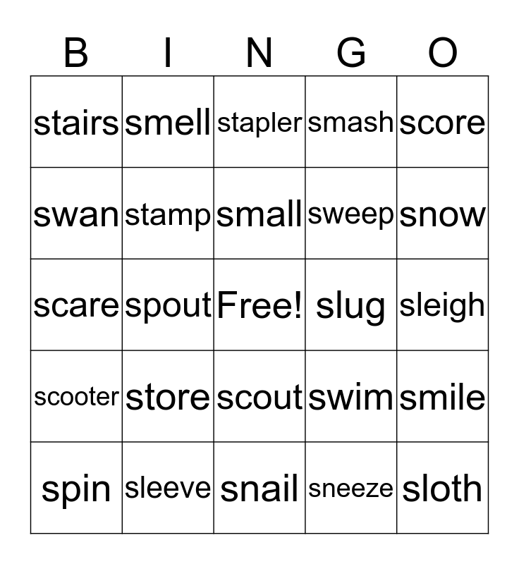 This bingo card has a free space and 29 words: spin, spoon, spout, space, stairs, stapler, stamp, store, slug, sleeve, sleigh, sloth, snail, sneeze, snow, snack, scout, scooter, score, scare, swim, swing, sweep, swan, smash, smell, smile, small and smoke.