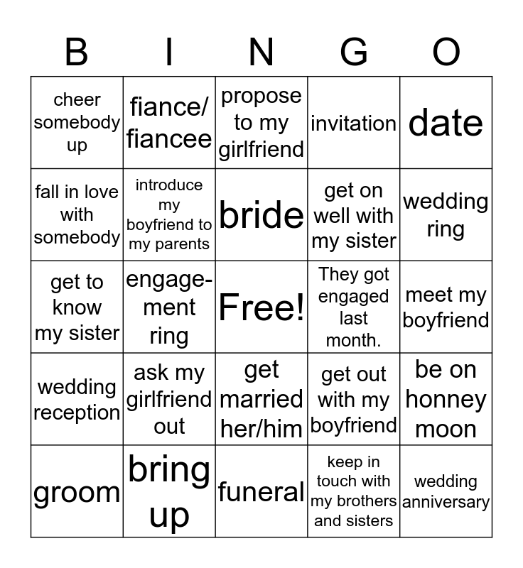 This bingo card has a free space and 24 words: ask my girlfriend out, bring up, bride, groom, date, cheer somebody up, fall in love with somebody, fiance/ fiancee, They got engaged last month., get married her/him, get on well with my sister, get to know my sister, get out with my boyfriend, be on honney moon, introduce my boyfriend to my parents, keep in touch with my brothers and sisters, meet my boyfriend, propose to my girlfriend, wedding ring, engage-ment ring, wedding anniversary, wedding reception, invitation and funeral.
