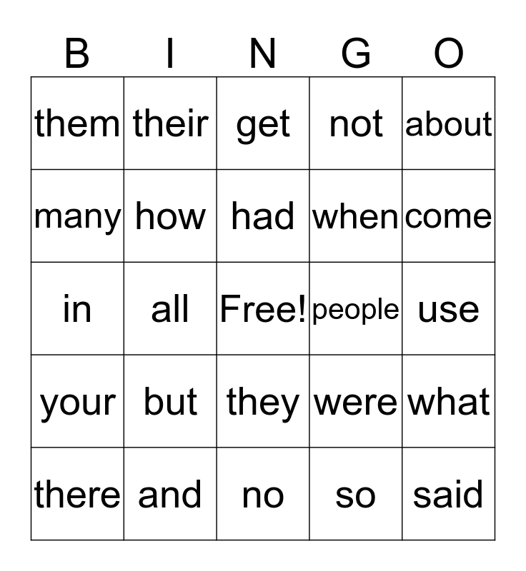 This bingo card has a free space and 24 words: but, and, had, there, about, them, many, their, people, they, when, in, were, what, how, so, use, get, come, all, said, your, not and no.