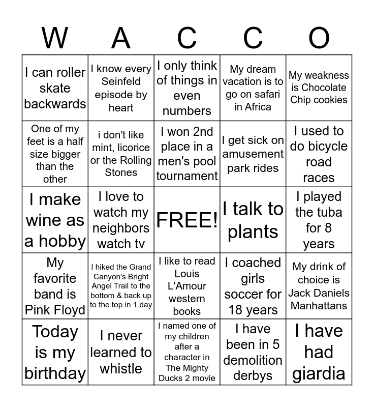 This bingo card has a free space and 24 words: I hiked the Grand Canyon's Bright Angel Trail to the bottom & back up to the top in 1 day, I never learned to whistle, I won 2nd place in a men's pool tournament, Today is my birthday, My weakness is Chocolate Chip cookies, I can roller skate backwards, One of my feet is a half size bigger than the other, I know every Seinfeld episode by heart, I talk to plants, I like to read Louis L'Amour western books, I get sick on amusement park rides, I make wine as a hobby, I coached girls soccer for 18 years, My drink of choice is Jack Daniels Manhattans, i don't like mint, licorice or the Rolling Stones, I have been in 5 demolition derbys, I played the tuba for 8 years, I only think of things in even numbers, I used to do bicycle road races, I love to watch my neighbors watch tv, I have had giardia, My favorite band is Pink Floyd, My dream vacation is to go on safari in Africa and I named one of my children after a character in The Mighty Ducks 2 movie.