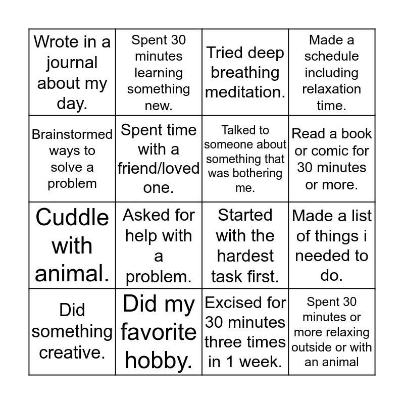This bingo card has 1 images and 30 words: Slept/ rested for 9 hours., Did homework as soon as I got home., Excised for 30 minutes three times in 1 week., Chose a healthy snack instead of junk food., Wrote in a journal about my day., Spent 30 minutes learning something new., Talked to someone about something that was bothering me., Spent 30 minutes or more relaxing outside or with an animal, Free!, Did my favorite hobby., Said a positive affirmation to myself when I was stressed., Made a list of things i needed to do., Wanted to procrastinate, but did something important instead., Watched my favorite TV/Netflix show., Started with the hardest task first., Said "no" to an optional request so I could have time for myself., Found something that made me laugh when I was upset., Asked for help with a problem., Stretched my muscles or did yoga., Made a schedule including relaxation time., Did something creative., Listened to some music when I felt stressed., Tried deep breathing meditation., Read a book or comic for 30 minutes or more., Brainstormed ways to solve a problem, Spent time with a friend/loved one., Went to a local coffee just watch the world go by without working on your computer or looking at your phone., Took a bath with warm water water and scented bath salts., Cuddle with animal. and Went to the movies..