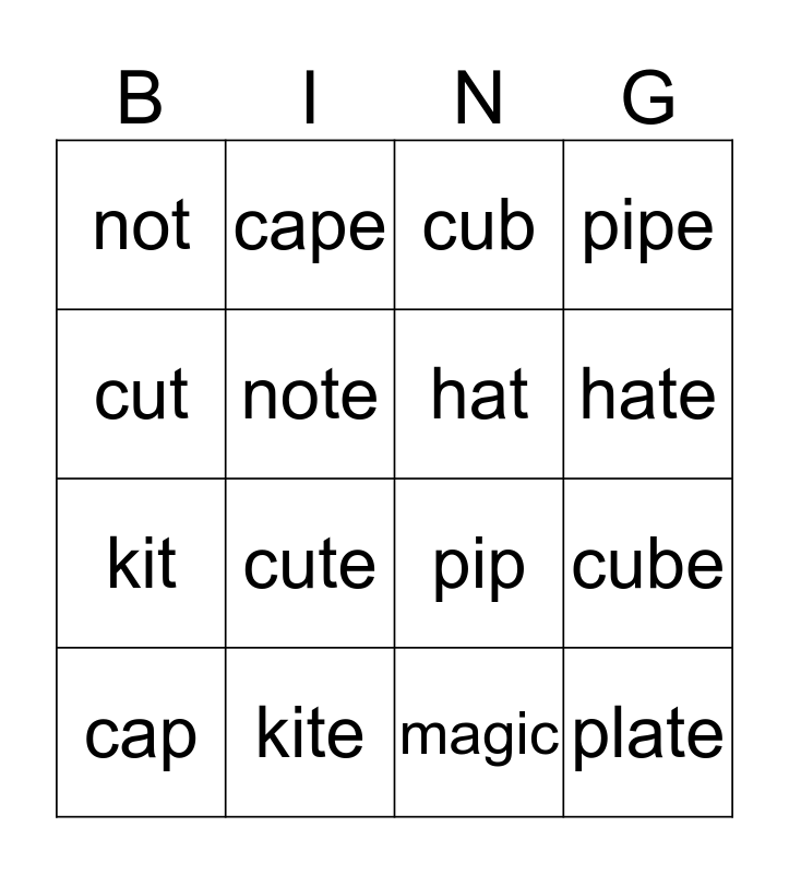 This bingo card has 17 words: Free!, cap, cape, cub, cube, cut, cute, hat, hate, kit, kite, pip, pipe, not, note, magic and plate.