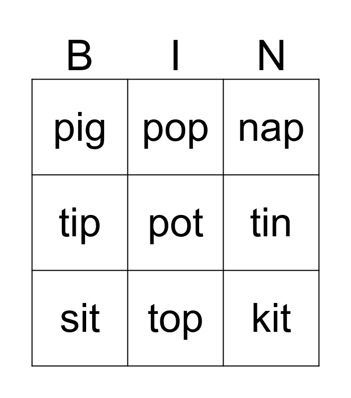 This bingo card has a free space and 9 words: sit, nap, pop, tip, pig, tin, kit, cap and top.