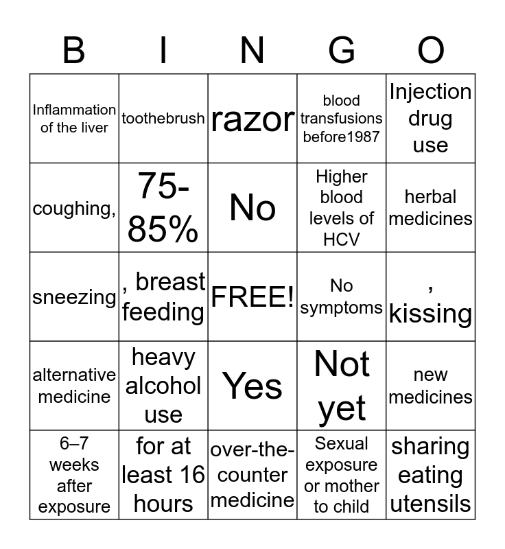 This bingo card has a free space and 24 words: heavy alcohol use, for at least 16 hours, No, 6–7 weeks after exposure, Injection drug use, Inflammation of the liver, coughing,, toothebrush, No symptoms, Yes, Higher blood levels of HCV, sneezing, Not yet, new medicines, 75-85%, Sexual exposure or mother to child, , kissing, razor, herbal medicines, , breast feeding, sharing eating utensils, alternative medicine, blood transfusions before1987 and over-the-counter medicine.