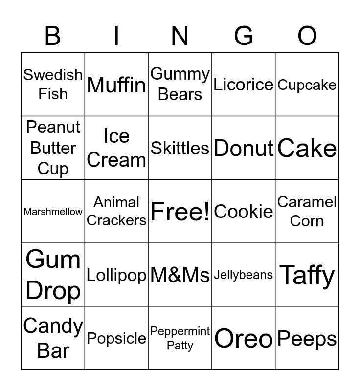 This bingo card has a free space and 24 words: Lollipop, Popsicle, Skittles, Candy Bar, Cupcake, Swedish Fish, Peanut Butter Cup, Muffin, Cookie, M&Ms, Donut, Marshmellow, Jellybeans, Taffy, Ice Cream, Oreo, Caramel Corn, Gummy Bears, Cake, Animal Crackers, Peeps, Gum Drop, Licorice and Peppermint Patty.