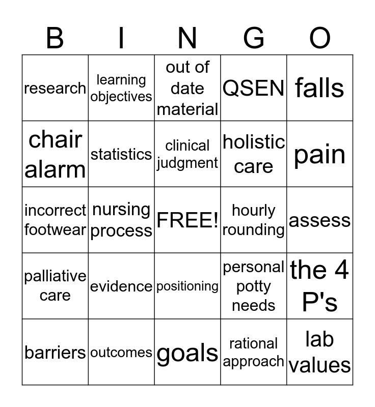 This bingo card has a free space and 24 words: evidence, outcomes, clinical judgment, barriers, falls, research, chair alarm, learning objectives, hourly rounding, positioning, holistic care, incorrect footwear, personal potty needs, the 4 P's, statistics, rational approach, assess, out of date material, pain, nursing process, lab values, palliative care, QSEN and goals.