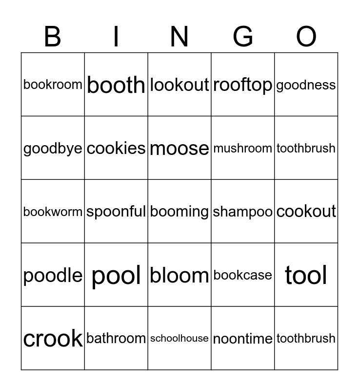 This bingo card has a free space and 27 words: bookcase, balloon, mushroom, schoolhouse, goodbye, lookout, booth, poodle, shampoo, tool, bookworm, rooftop, crook, bathroom, toothbrush, took, cookies, moose, pool, bookroom, cookout, noontime, spoonful, toothbrush, bloom, goodness and football.