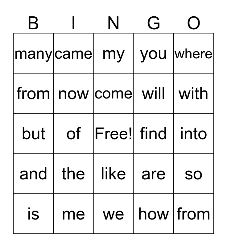 This bingo card has a free space and 29 words: what, me, my, the, where, many, now, come, find, so, is, of, how, from, but, on, we, are, with, and, the, this, will, into, from, came, like, you and see.