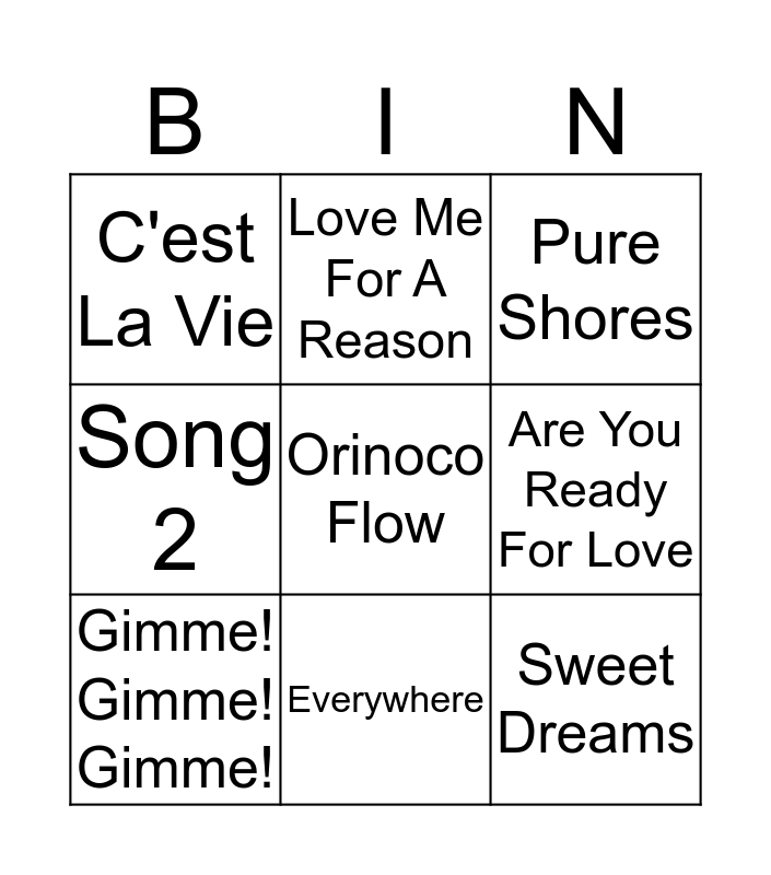 This bingo card has 9 words: Gimme! Gimme! Gimme!, Pure Shores, Love Me For A Reason, Song 2, C'est La Vie, Are You Ready For Love, Orinoco Flow, Sweet Dreams and Everywhere.