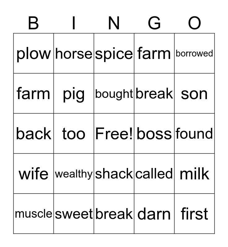 This bingo card has a free space and 24 words: wealthy, sweet, bought, muscle, borrowed, plow, farm, horse, boss, shack, break, back, called, milk, pig, darn, found, spice, son, too, first, wife, farm and break.