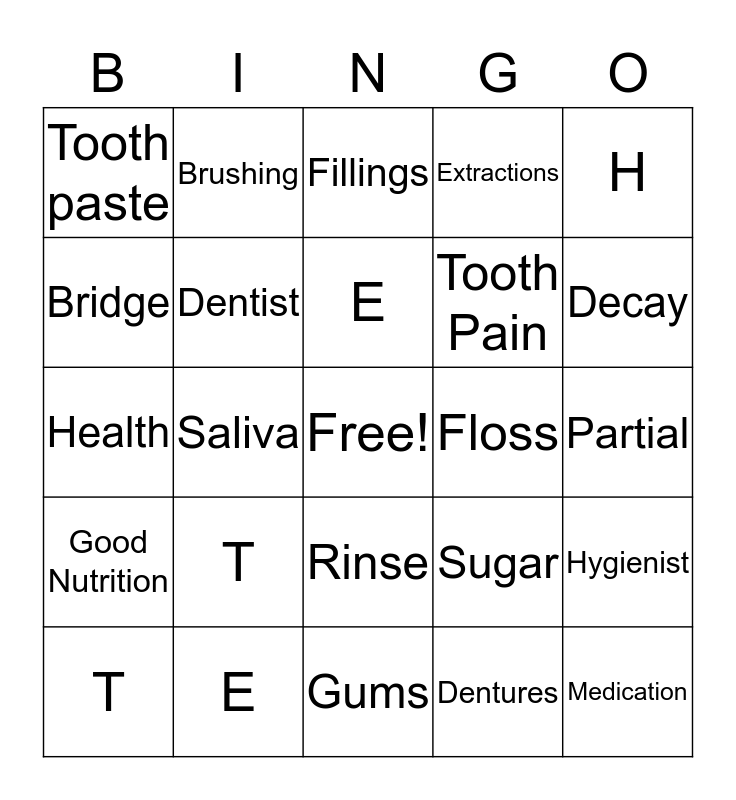 This bingo card has a free space and 24 words: T, E, E, T, H, Tooth paste, Bridge, Brushing, Floss, Rinse, Tooth Pain, Health, Sugar, Hygienist, Dentist, Dentures, Partial, Fillings, Decay, Saliva, Medication, Good Nutrition, Extractions and Gums.