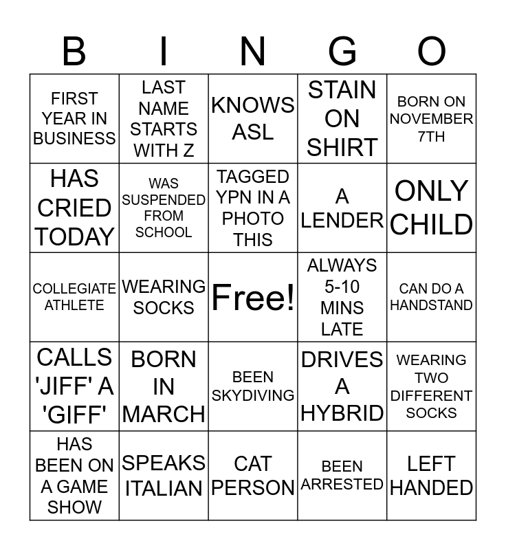 This bingo card has a free space and 39 words: NOT WEARING PANTS, NO HAIR, WEARING RED LIP STICK, WAS SUSPENDED FROM SCHOOL, HAS BEEN ON A GAME SHOW, BEEN SKYDIVING, TAGGED YPN IN A PHOTO THIS, BEEN TO A YPN EVENT, BORN ON NOVEMBER 7TH, CALLS 'JIFF' A 'GIFF', WEARING SOCKS, STAIN ON SHIRT, LEFT HANDED, CAN DO A HANDSTAND, ALWAYS 5-10 MINS LATE, BORN IN MARCH, WEARS GLASSES, FIRST YEAR IN BUSINESS, DOG PERSON, DRIVES A HYBRID, HAS CRIED TODAY, CAT PERSON, A LENDER, ONLY CHILD, HAS NO MIDDLE NAME, A LIBRA, DOESN'T DRINK COFFEE, A VEGAN, DOESN'T DRINK ALCOHOL, LAST NAME STARTS WITH Z, WEARING A FLANNEL, CAN YODDLE, KNOWS ASL, SPEAKS ITALIAN, BEEN ARRESTED, HAS A TATTOO, WEARING TWO DIFFERENT SOCKS, COLLEGIATE ATHLETE and NEVER HAD A CAVITY.