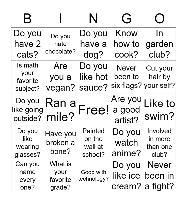 This bingo card has a free space and 24 words: Have you broken a bone?, What is your favorite grade?, Do you like hot sauce?, Can you name every one?, In garden club?, Do you have 2 cats?, Is math your favorite subject?, Do you hate chocolate?, Are you a good artist?, Painted on the wall at school?, Never been to six flags?, Do you like going outside?, Do you watch anime?, Involved in more than one club?, Are you a vegan?, Do you like ice cream?, Like to swim?, Do you have a dog?, Cut your hair by your self?, Ran a mile?, Never been in a fight?, Do you like wearing glasses?, Know how to cook? and Good with technology?.
