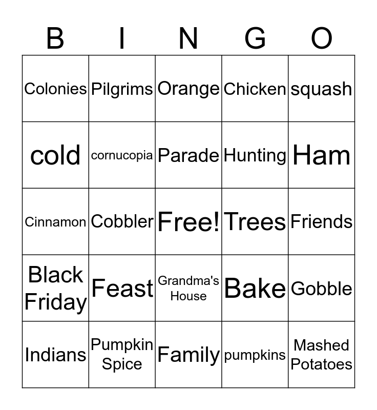 This bingo card has a free space and 34 words: turkey, pumpkins, pumpkin pie, cranberry sauce, Black Friday, cornucopia, squash, Indians, Pilgrims, Football, Parade, Orange, Fall, Leaves, Trees, Ham, Pumpkin Spice, Cinnamon, Feast, Bake, Grandma's House, Americans, Colonies, Friends, Family, Mashed Potatoes, Chicken, Fireplace, Hunting, cold, Beets, Cobbler, Gobble and Brown.