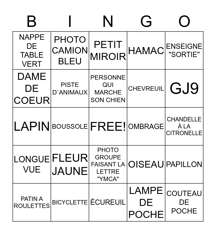 This bingo card has a free space and 24 words: FLEUR JAUNE, BICYCLETTE, PERSONNE QUI MARCHE SON CHIEN, PATIN A ROULETTES, ENSEIGNE "SORTIE", NAPPE DE TABLE VERT, DAME DE COEUR, PHOTO CAMION BLEU, OMBRAGE, PHOTO GROUPE FAISANT LA LETTRE "YMCA", CHEVREUIL, LAPIN, OISEAU, PAPILLON, PISTE D`ANIMAUX, LAMPE DE POCHE, CHANDELLE À LA CITRONELLE, PETIT MIROIR, GJ9, BOUSSOLE, COUTEAU DE POCHE, LONGUE VUE, HAMAC and ÉCUREUIL.