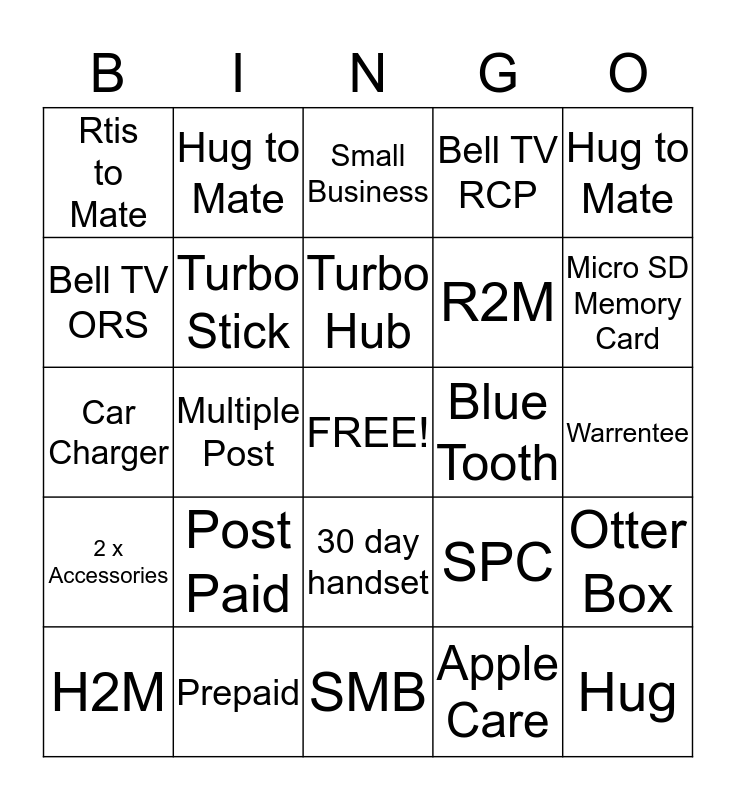 This bingo card has a free space and 24 words: Post Paid, Prepaid, Turbo Hub, H2M, Hug to Mate, Rtis to Mate, Bell TV ORS, Hug to Mate, Blue Tooth, 30 day handset, R2M, Car Charger, SPC, Otter Box, Turbo Stick, Apple Care, Warrentee, Small Business, Micro SD Memory Card, Multiple Post, Hug, 2 x Accessories, Bell TV RCP and SMB.