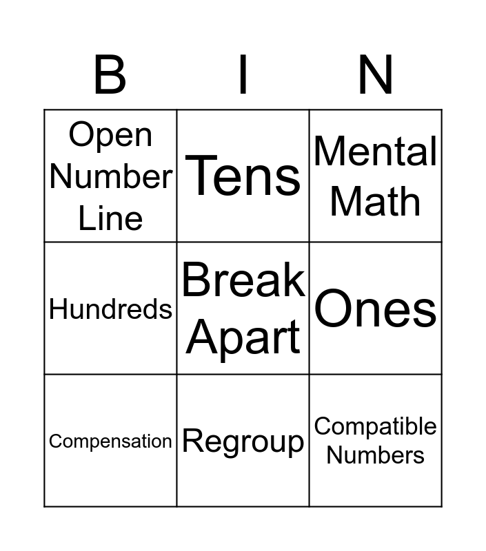 This bingo card has 9 words: Compensation, Mental Math, Tens, Hundreds, Open Number Line, Ones, Break Apart, Compatible Numbers and Regroup.