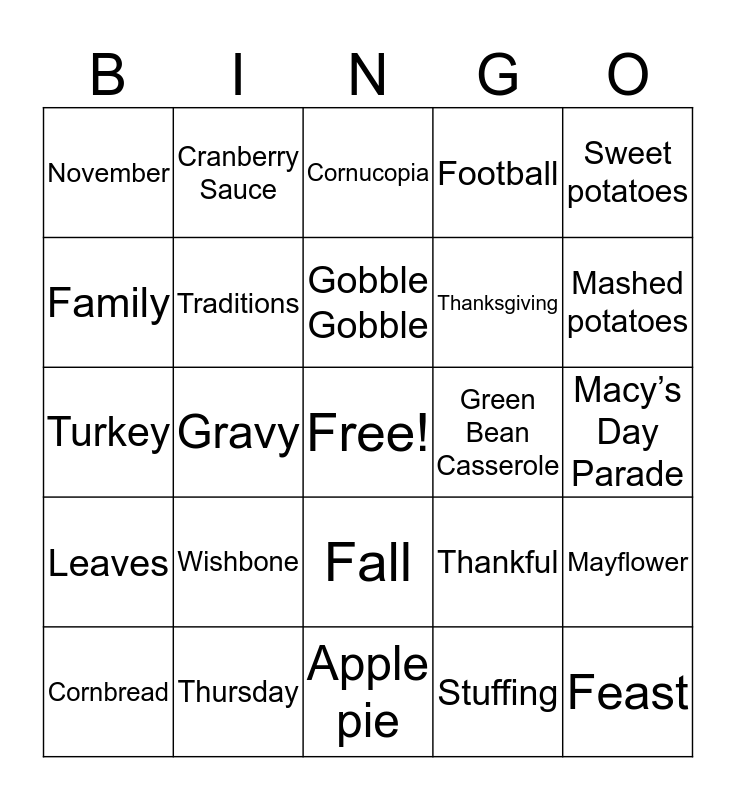 This bingo card has a free space and 24 words: Wishbone, Thursday, Gobble Gobble, Cornbread, Sweet potatoes, November, Family, Cranberry Sauce, Green Bean Casserole, Fall, Thanksgiving, Turkey, Thankful, Mayflower, Traditions, Stuffing, Macy’s Day Parade, Cornucopia, Mashed potatoes, Gravy, Feast, Leaves, Football and Apple pie.