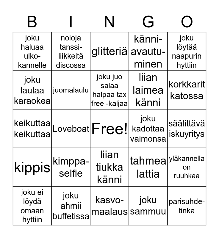This bingo card has a free space and 24 words: kimppa-selfie, joku ahmii buffetissa, joku juo salaa halpaa tax free -kaljaa, joku ei löydä omaan hyttiin, joku löytää naapurin hyttiin, joku haluaa ulko- kannelle, joku laulaa karaokea, noloja tanssi- liikkeitä discossa, joku kadottaa vaimonsa, liian tiukka känni, liian laimea känni, keikuttaa keikuttaa, tahmea lattia, yläkannella on ruuhkaa, juomalaulu, joku sammuu, säälittävä iskuyritys, glitteriä, korkkarit katossa, Loveboat, parisuhde-tinka, kippis, känni-avautu-minen and kasvo- maalaus.