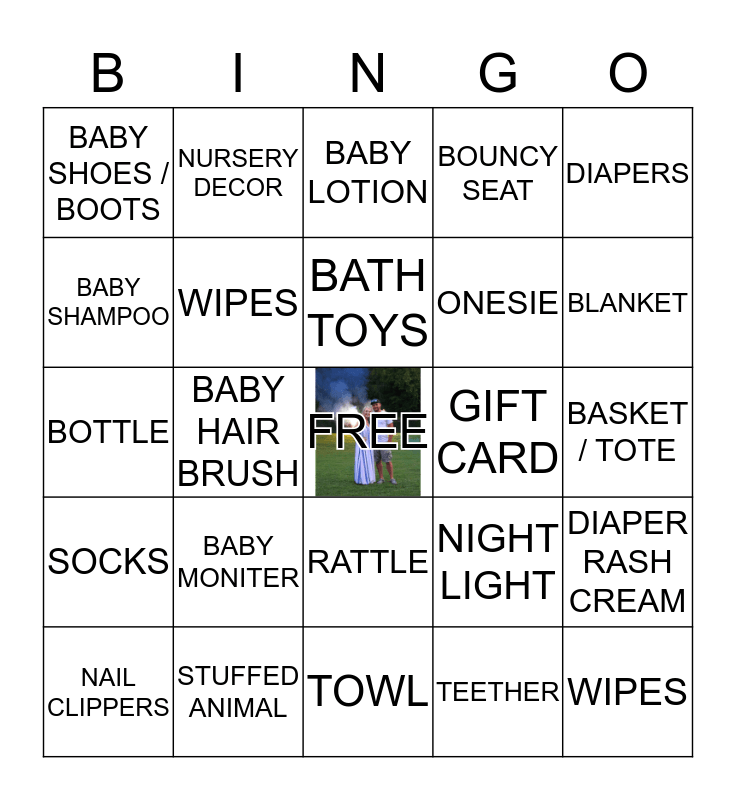 This bingo card has a free space and 34 words: BIBS, TEETHER, SOFT BABY TOY, SHEETS, SOCKS, WIPES, DIAPERS, NAIL CLIPPERS, NURSERY DECOR, BABY GATE, BATH TOYS, BABY LOTION, PHOTO FRAME, CAR SEAT, GIFT CARD, BLANKET, STUFFED ANIMAL, BOTTLE, BABY MONITER, NIGHT LIGHT, RATTLE, SWADDLE BLANKET, BABY SHOES / BOOTS, BASKET / TOTE, TOWL, WIPES, BOUNCY SEAT, DIAPER BAG, ONESIE, BABY SHAMPOO, BABY BATH, BABY HAIR BRUSH, DIAPER RASH CREAM and BOTTLE CLEANER.