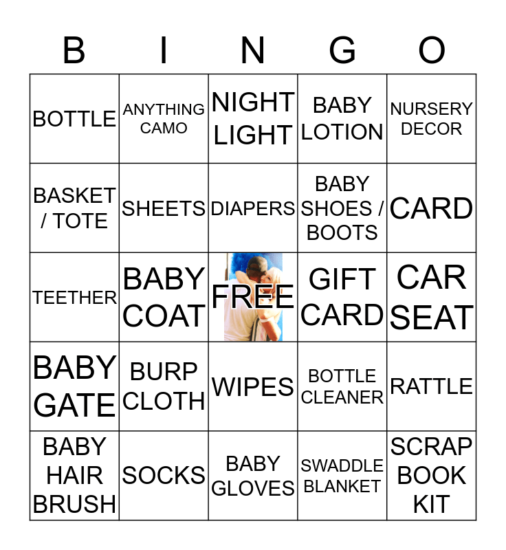 This bingo card has a free space and 40 words: BIBS, TEETHER, SOFT BABY TOY, SHEETS, SOCKS, WIPES, DIAPERS, NAIL CLIPPERS, NURSERY DECOR, BABY GATE, BABY COAT, BABY LOTION, SCRAP BOOK KIT, CAR SEAT, GIFT CARD, BURP CLOTH, STUFFED ANIMAL, BOTTLE, LOTION FOR MOM, NIGHT LIGHT, RATTLE, SWADDLE BLANKET, BABY SHOES / BOOTS, BASKET / TOTE, TOWL, WIPES, BOUNCY SEAT, DIAPER BAG, ONESIE, BABY SHAMPOO, BABY BATH, BABY HAIR BRUSH, DIAPER RASH CREAM, BOTTLE CLEANER, CARD, BABY GLOVES, BABY TEETH CARE, MONEY!, ANYTHING CAMO and PHOTO FRAME.