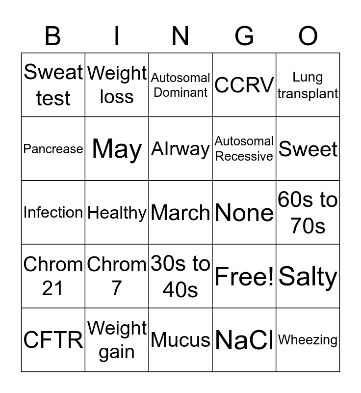 This bingo card has 25 words: Chrom 7, Mucus, AIrway, CFTR, Lung transplant, Sweat test, Pancrease, Weight loss, None, 30s to 40s, Autosomal Recessive, Infection, Free!, Salty, May, Wheezing, 60s to 70s, Autosomal Dominant, Sweet, Healthy, March, Weight gain, Chrom 21, CCRV and NaCl.