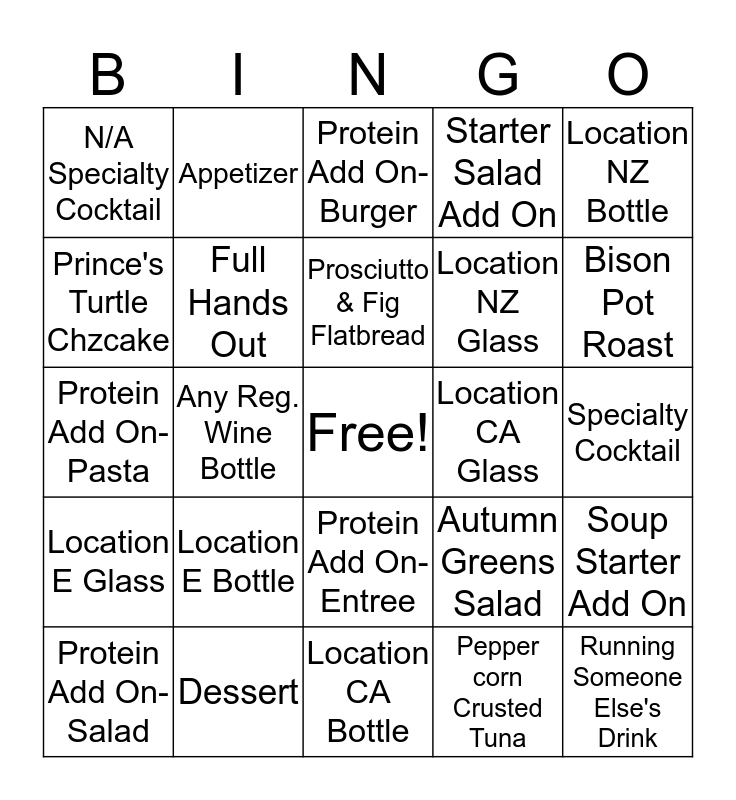 This bingo card has a free space and 24 words: Location E Bottle, Dessert, Prosciutto & Fig Flatbread, Protein Add On- Salad, Location NZ Bottle, N/A Specialty Cocktail, Prince's Turtle Chzcake, Appetizer, Location CA Glass, Protein Add On- Entree, Location NZ Glass, Protein Add On- Pasta, Autumn Greens Salad, Soup Starter Add On, Full Hands Out, Pepper corn Crusted Tuna, Specialty Cocktail, Protein Add On- Burger, Bison Pot Roast, Any Reg. Wine Bottle, Running Someone Else's Drink, Location E Glass, Starter Salad Add On and Location CA Bottle.