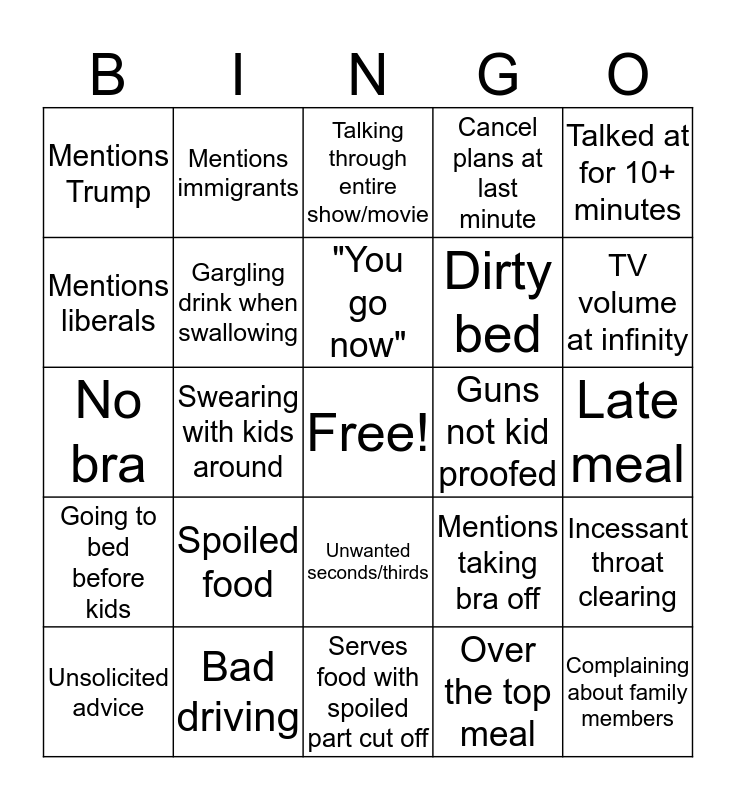 This bingo card has a free space and 24 words: Spoiled food, Bad driving, "You go now", Unsolicited advice, Talked at for 10+ minutes, Mentions Trump, Mentions liberals, Mentions immigrants, Guns not kid proofed, Unwanted seconds/thirds, Dirty bed, No bra, Mentions taking bra off, Incessant throat clearing, Gargling drink when swallowing, Over the top meal, Late meal, Talking through entire show/movie, TV volume at infinity, Swearing with kids around, Complaining about family members, Going to bed before kids, Cancel plans at last minute and Serves food with spoiled part cut off.