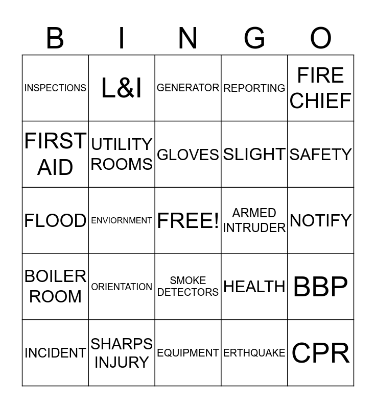 This bingo card has a free space and 29 words: INCIDENT, WHISTLE, ENVIORNMENT, WAC 296-27, INSPECTIONS, GENERATOR, UTILITY ROOMS, ORIENTATION, ARMED INTRUDER, SHARPS INJURY, NOTIFY, CPR, EQUIPMENT, ERTHQUAKE, SAFETY, MAIN SHUT OFF, SMOKE DETECTORS, BOILER ROOM, FIRE CHIEF, FLOOD, HEALTH, HAND WASHING, SLIGHT, FIRST AID, REPORTING, L&I, BBP, GLOVES and HOYER LIFT.