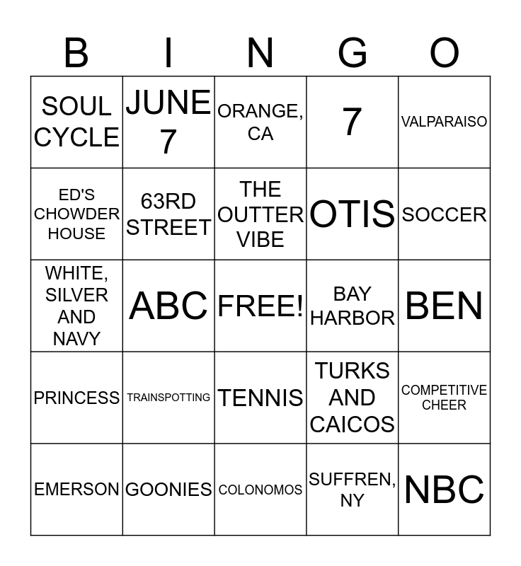 This bingo card has a free space and 24 words: TRAINSPOTTING, GOONIES, THE OUTTER VIBE, EMERSON, VALPARAISO, SOUL CYCLE, ED'S CHOWDER HOUSE, JUNE 7, BAY HARBOR, TENNIS, OTIS, WHITE, SILVER AND NAVY, TURKS AND CAICOS, COMPETITIVE CHEER, 63RD STREET, SUFFREN, NY, BEN, ORANGE, CA, SOCCER, ABC, NBC, PRINCESS, 7 and COLONOMOS.