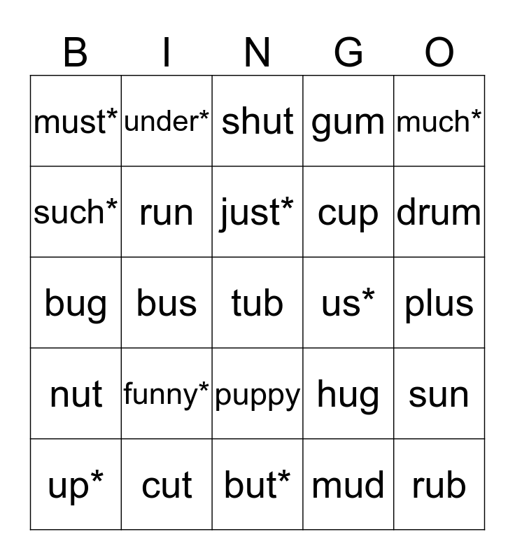 This bingo card has 25 words: funny*, but*, just*, up*, much*, must*, such*, under*, us*, puppy, cup, bug, hug, sun, run, rub, plus, shut, drum, bus, tub, cut, nut, gum and mud.