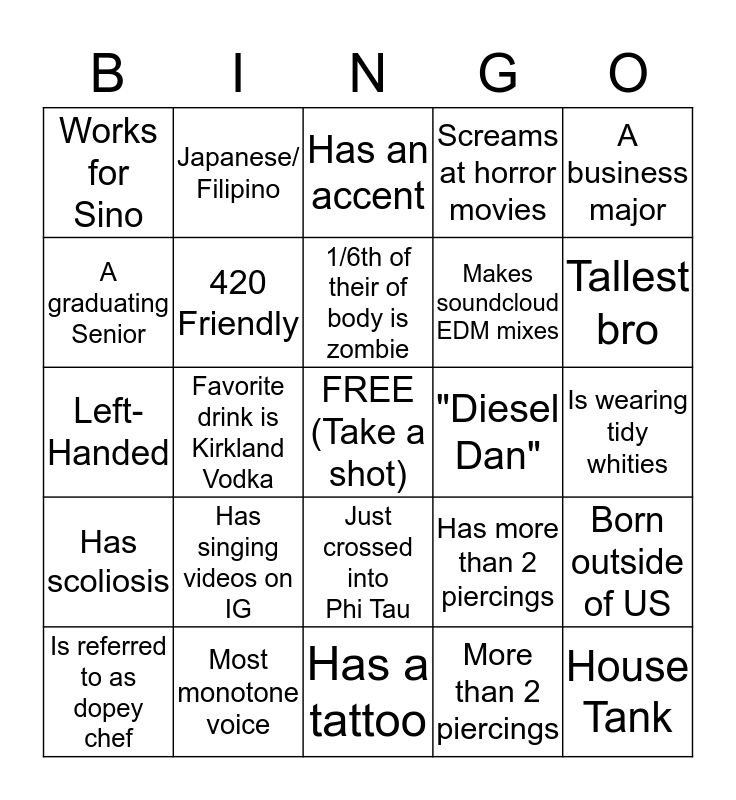 This bingo card has a free space and 24 words: Has singing videos on IG, Most monotone voice, 1/6th of their of body is zombie, Is referred to as dopey chef, A business major, Works for Sino, A graduating Senior, Japanese/ Filipino, "Diesel Dan", Just crossed into Phi Tau, Makes soundcloud EDM mixes, Left-Handed, Has more than 2 piercings, Born outside of US, 420 Friendly, More than 2 piercings, Is wearing tidy whities, Has an accent, Tallest bro, Favorite drink is Kirkland Vodka, House Tank, Has scoliosis, Screams at horror movies and Has a tattoo.