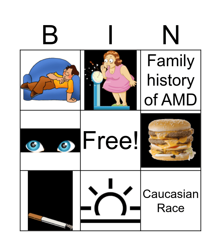 This bingo card has 7 images, a free space and 4 words: Maintain a healthy weight, Caucasian Race, Family history of AMD and High Blood Pressure.