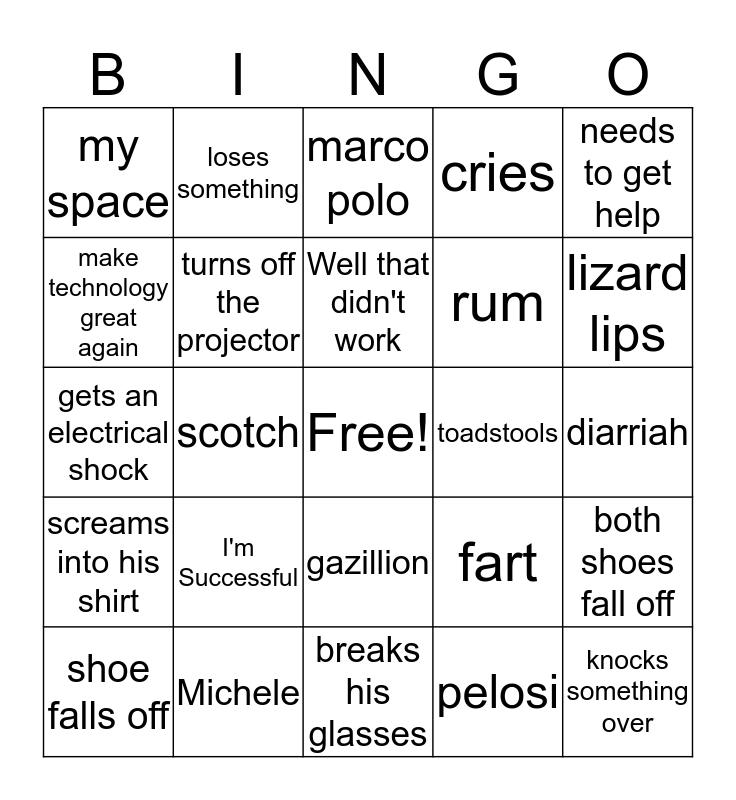 This bingo card has a free space and 24 words: I'm Successful, Michele, Well that didn't work, shoe falls off, needs to get help, my space, make technology great again, loses something, toadstools, gazillion, rum, gets an electrical shock, fart, both shoes fall off, turns off the projector, pelosi, diarriah, marco polo, lizard lips, scotch, knocks something over, screams into his shirt, cries and breaks his glasses.