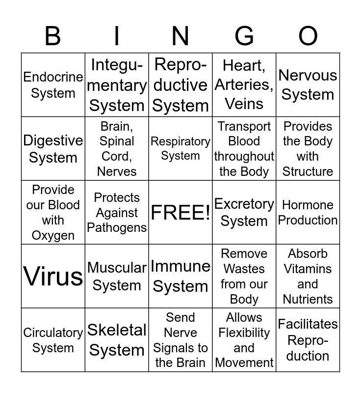 This bingo card has a free space and 24 words: Muscular System, Skeletal System, Respiratory System, Circulatory System, Nervous System, Endocrine System, Digestive System, Integu- mentary System, Excretory System, Immune System, Transport Blood throughout the Body, Provide our Blood with Oxygen, Remove Wastes from our Body, Absorb Vitamins and Nutrients, Brain, Spinal Cord, Nerves, Allows Flexibility and Movement, Hormone Production, Repro- ductive System, Provides the Body with Structure, Protects Against Pathogens, Facilitates Repro- duction, Virus, Heart, Arteries, Veins and Send Nerve Signals to the Brain.