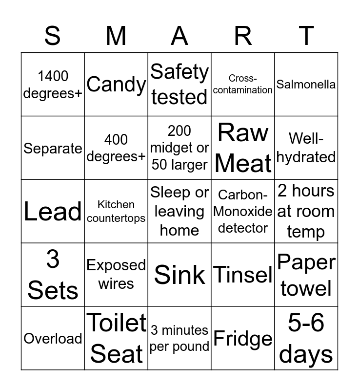 This bingo card has a free space and 34 words: Glass Ornaments, Fridge, Carpet or Rugs, Perfringen, 3 Sets, 400 degrees+, Salmonella, Overload, Candy, Bacteria, 200 midget or 50 larger, Safety tested, 200 times, Tree Needles/ Ornaments, Carbon-Monoxide detector, Well-hydrated, Toilet Seat, Lead, Exposed wires, Tinsel, Sink, 30 seconds, 1400 degrees+, 2 hours at room temp, 3 minutes per pound, 5-6 days, Cross-contamination, Separate cutting boards, Raw Meat, Separate, Bottom shelf, Kitchen countertops, Paper towel and Food- Bourne Illness.