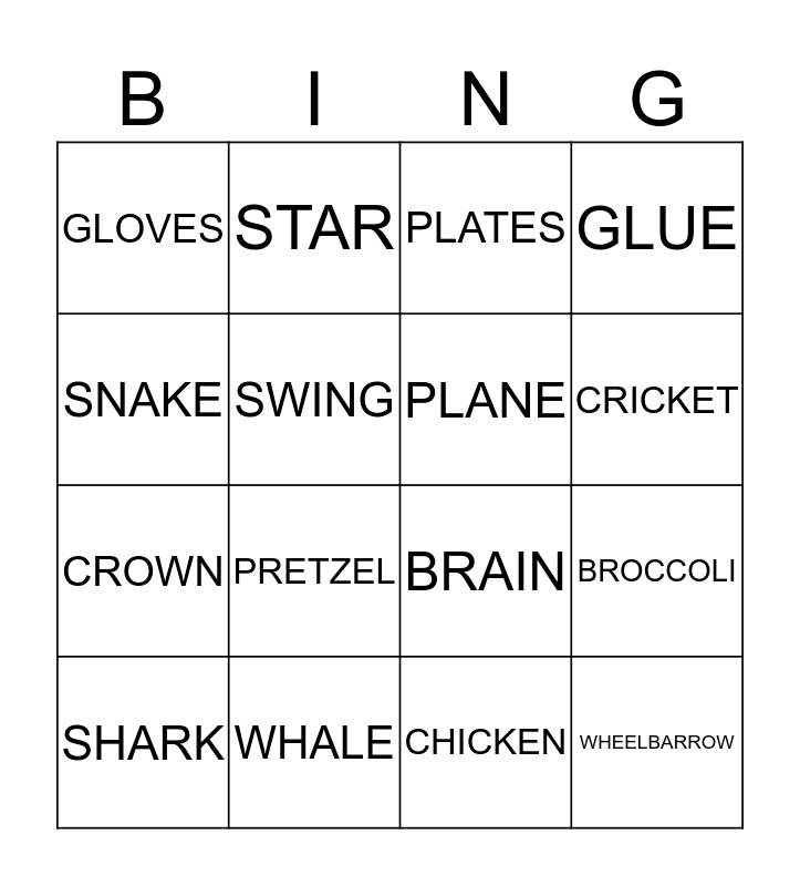 This bingo card has 52 words: CLOCK, SHARK, DRUM, SKUNK, FRUITS, CHAIR, STAR, PRESENTS, SWING, SLED, PLANE, FLOWER, FROG, TWINS, TRUCK, BLENDER, CRICKET, WHALE, SPOON, SNAKE, BROCCOLI, THUMB, GLOVES, CROWN, BRUSH, WHISTLE, CRAB, SHIRT, PRETZEL, THERMOMETER, STAPLER, GLUE, WREATH, CLOWN, DRAWERS, PLATES, SPIDER, SNAIL, SNEAKERS, TREE, FLASHLIGHT, CHICKEN, WHEELBARROW, BREAD, GRAPES, FLAG, BLOCKS, BRAIN, CLOTHESPIN, FLUTE, SHOVEL and GLASSES.
