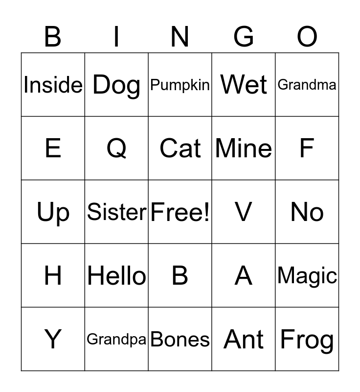 This bingo card has a free space and 71 words: Mom, Dog, You, Sad, Bones, M, Wet, Bird, Mine, J, Y, Halloween, F, Inside, Aunt, Up, A, Grandma, Spider, No, Hello, Frog, Magic, O, Dry, Yours, Happy, Down, Outside, Dad, Grandpa, Uncle, Pony, Monkey, Ant, Cousin, L, N, E, C, B, Z, H, I, K, N, P, Q, R, S, T, U, V, W, X, Ghost, Cat, Family, Friends, Me, Fish, Yes, Sister, Bro, Costume, Autumn, Pumpkin, Horse, Bat, Candy and Holiday.