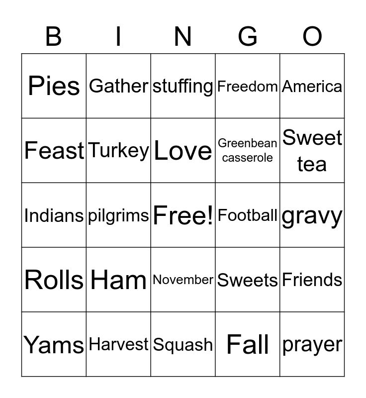 This bingo card has a free space and 29 words: Yams, mashed potatoes, pilgrims, Thursday, Pies, stuffing, Turkey, Ham, Football, Harvest, gravy, prayer, Squash, Fall, Sweet tea, Family, November, Rolls, America, Indians, Sweets, Plymouth, Greenbean casserole, Feast, Freedom, Gather, Friends, Love and blessings.