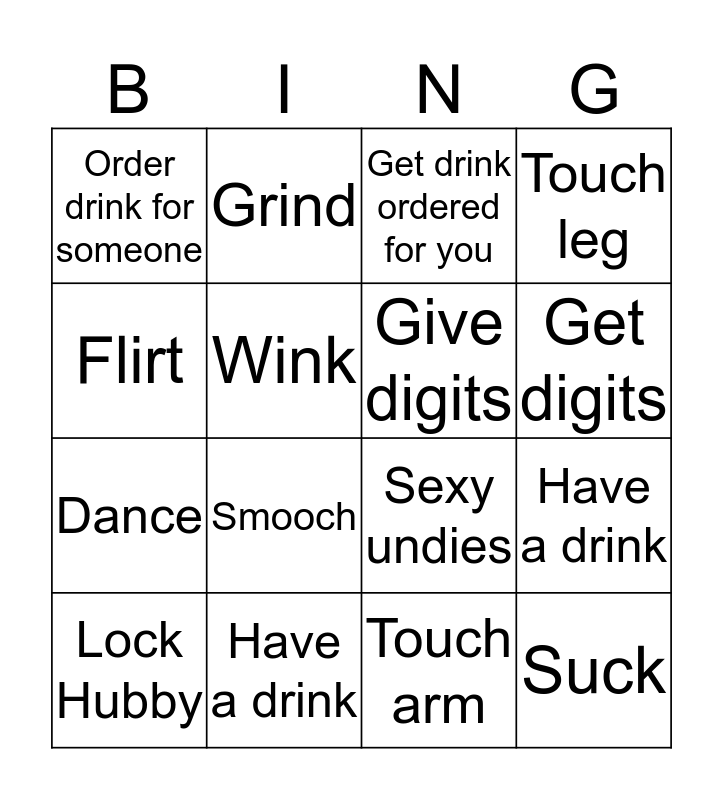 This bingo card has 16 words: Have a drink, Have a drink, Get drink ordered for you, Order drink for someone, Dance, Grind, Sexy undies, Touch arm, Flirt, Wink, Lock Hubby, Touch leg, Smooch, Get digits, Give digits and Suck.