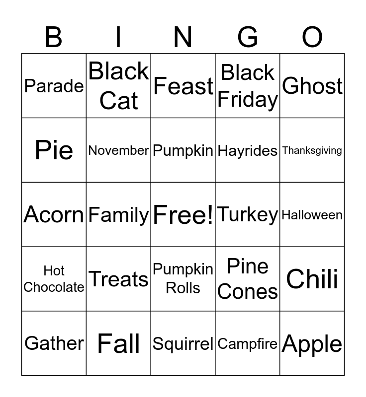 This bingo card has a free space and 48 words: Leaf, Apple, Football, Squirrel, Treats, Smores, Black Cat, Jackets, Pie, Autumn, November, Black Friday, Chili, Pine Cones, Deer, Mums, Pumpkin, Turkey, Rake, Ghost, Family, Campfire, Parade, Hayrides, Popcorn, Thanksgiving, Gather, Candles, Pumpkin Rolls, Hot Chocolate, Hunting, Candy, Scarecrow, Corn, Fall, Treats, Pilgrim, Halloween, Maze, Trees, Cider, Holiday, Feast, Breeze, Acorn, Shopping, Tailgate and Spider.